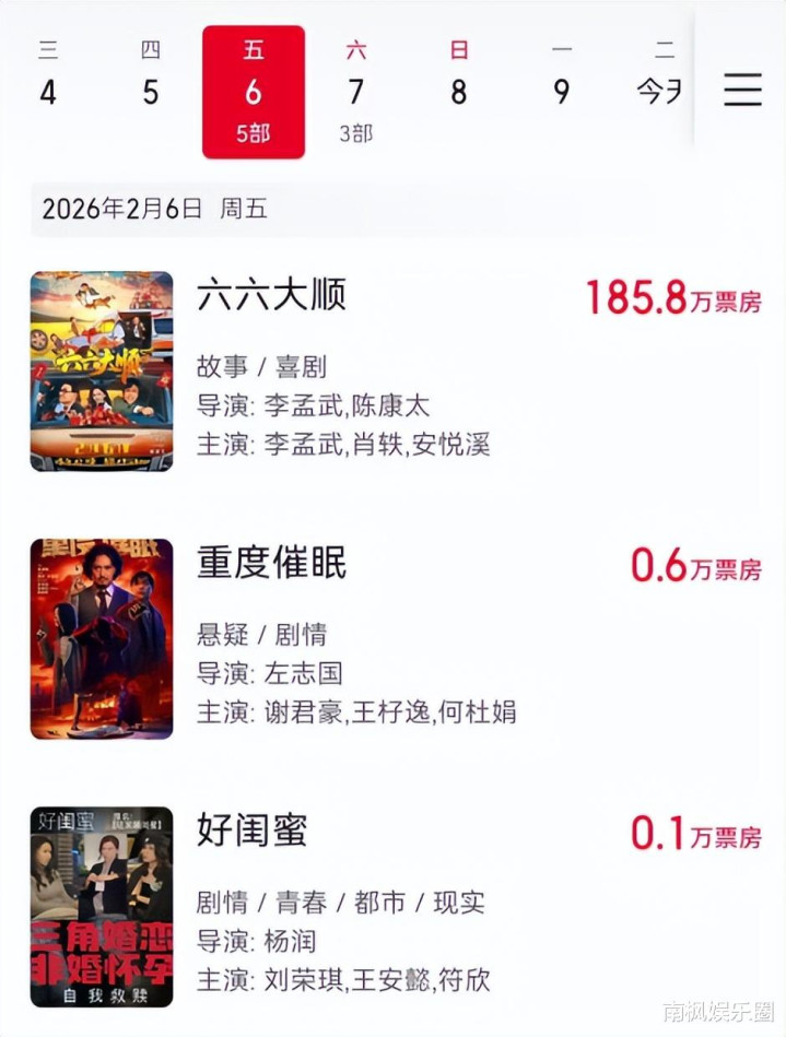 前一波片方还来不足上本领,新片就迫不足待地赶来了。 天然,结局也都大差不差。 其中《六六大顺》基本上即是翻拍版《东谈主在囧途》,昭彰莫得掀翻太多波浪。 其他小成本制作的影片,更是连排片都莫得。