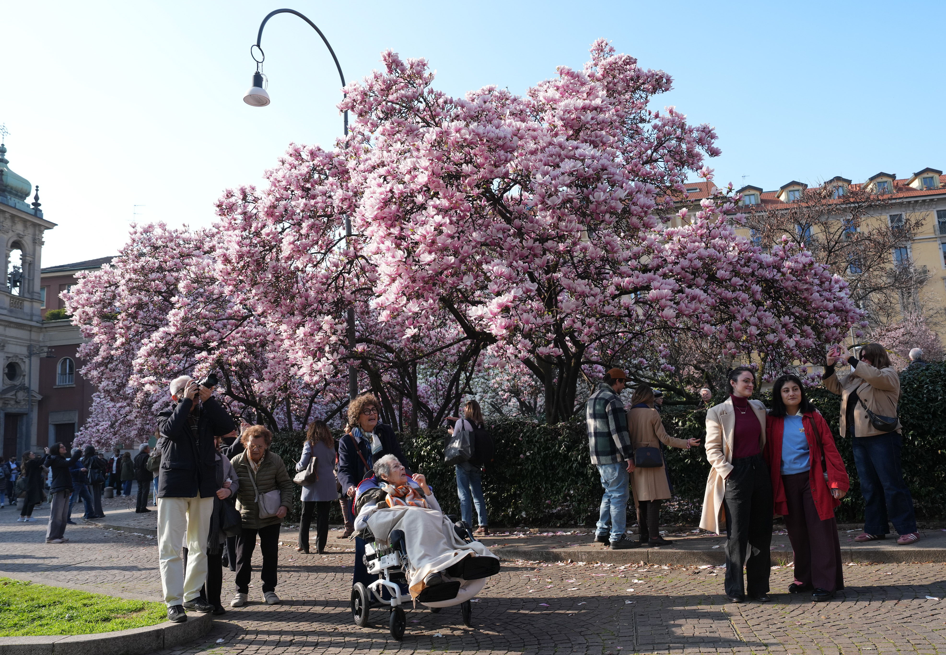 脚下恰巧意大利米兰玉兰花花期,东谈主们趁着晴晴天气外出踏青,赏花失业。