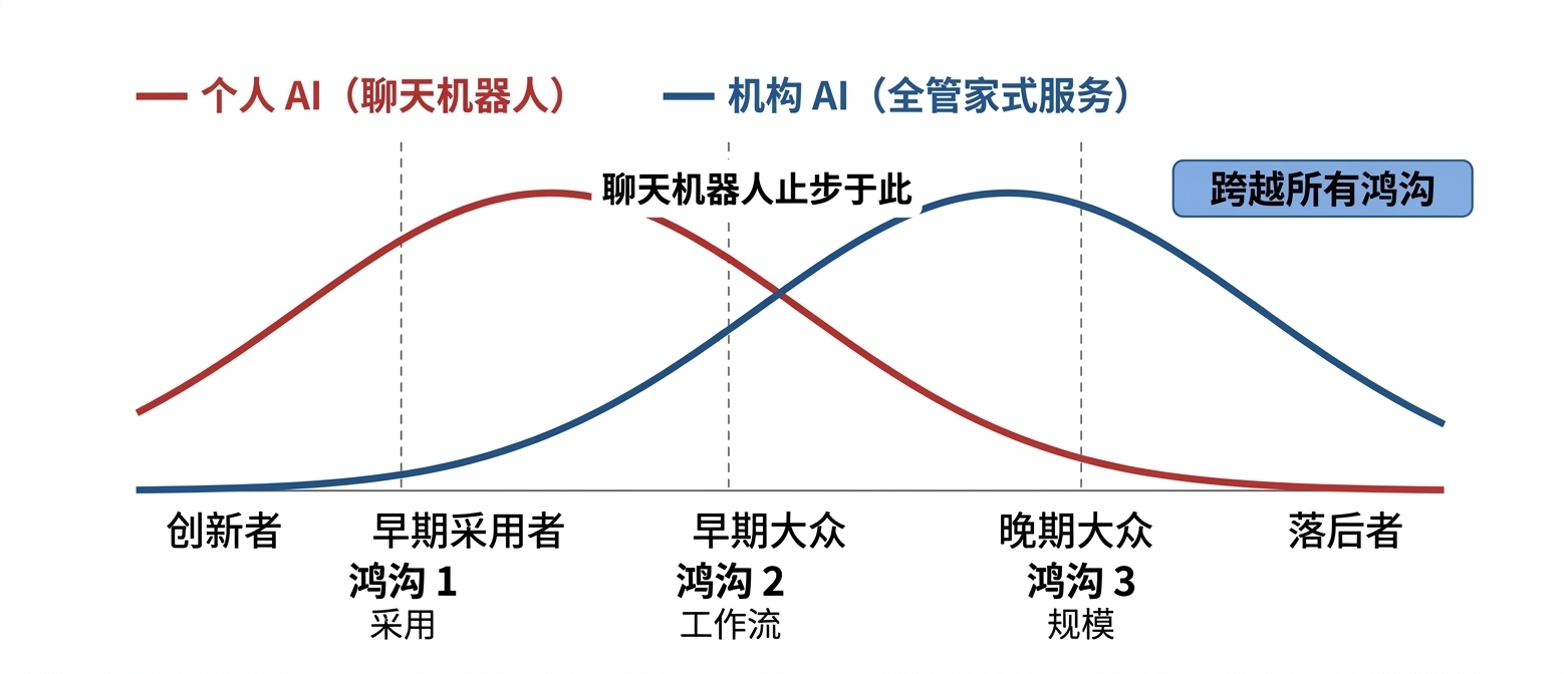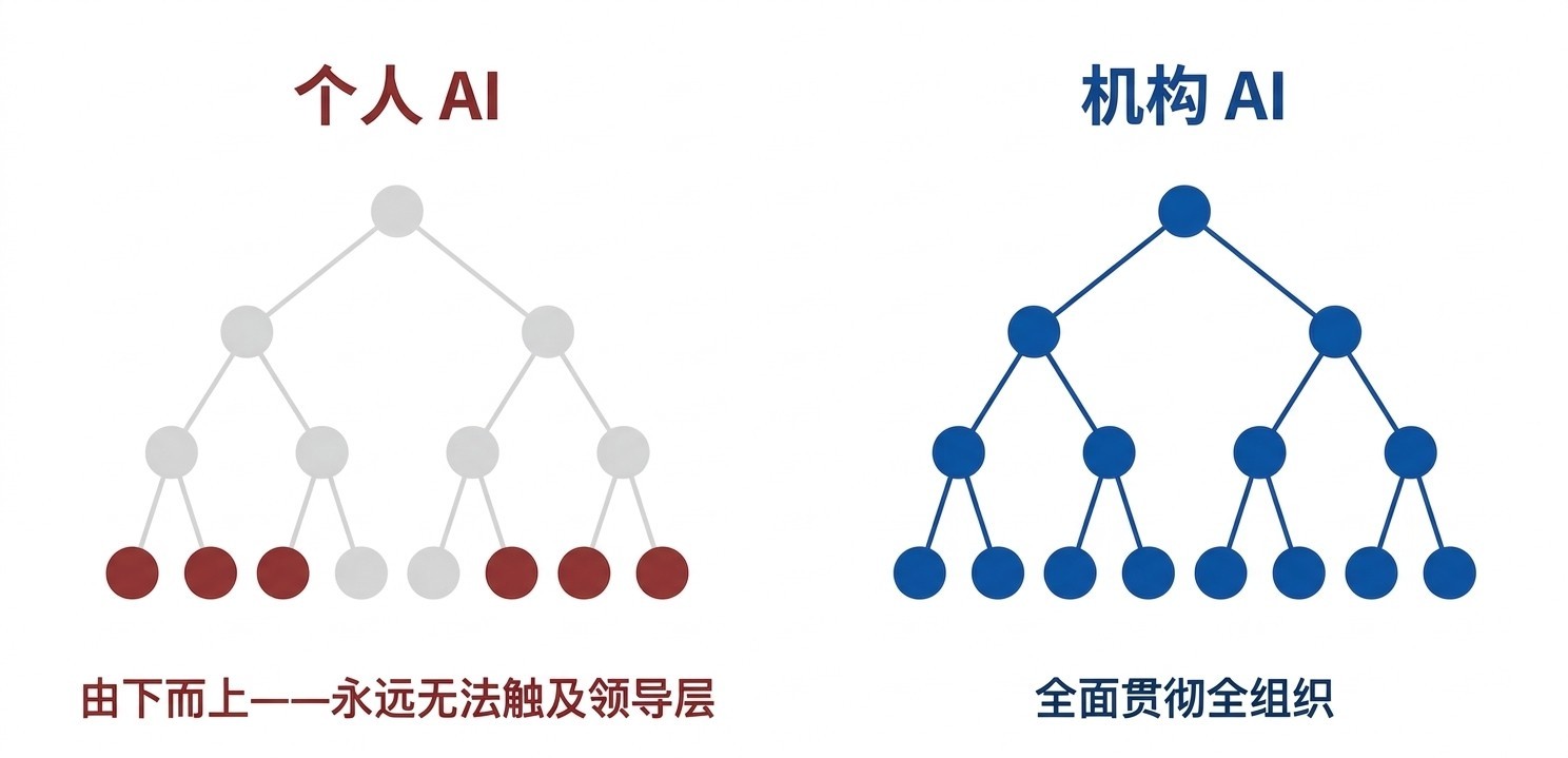 图 1:洛厄尔纺织厂(Lowell Textile Mills)的三次演变。从左至右按序为:1890 年的蒸汽能源工场、1900 年的电力发动机工场,以及 1920 年看成电气化活水线透彻重建的“单位驱动”工场。 这些讲述并非源于技能自己,也不是因为让单个工东谈主或机器纺纱的速率变快了。惟有当咱们最终将机构组织与技能同步再行遐想时,这种增长收益才着实判辨。 这是科技史上代价最为奋发的一课,而咱们现在正再行经历这一过程。 到 2026 年,AI 正驱动着那些懂得哄骗它的东谈主完结 10 倍的坐褥力增长。但这还远远不够。咱们只是更换了发动机,却还莫得再行遐想工场。 原因在于一个浅薄的中枢事实:个东谈主高产并不等同于企业高产。 绝大多数 AI 产物只是给东谈主一种“我很高效”的错觉,但在驱动现实价值方面却生效甚微。现时大多数公开的 AI 应用案例,不外是个东谈主在 Twitter 或公司 Slack 频谈里自我痴迷式地进行“坐褥力极限榨取”,对现实业务简直莫得任何实质性影响。