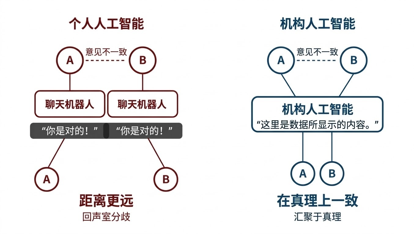 图 5:个东谈主化 AI 信息茧房加重了不对,将东谈主们互相拉开。这种动态在大范围扩张时,会在原来斡旋的组织内制造派别。 这揭示了一个紧要问题:这些个东谈主坐褥力用具在强化“用户”的不雅点。而在现实中,最需要被强化的应该是“真相”。 数千年来,组织进化的过程就是确立一套系统来对消这一问题:比如投资委员会会议、第三方尽调、董事会……