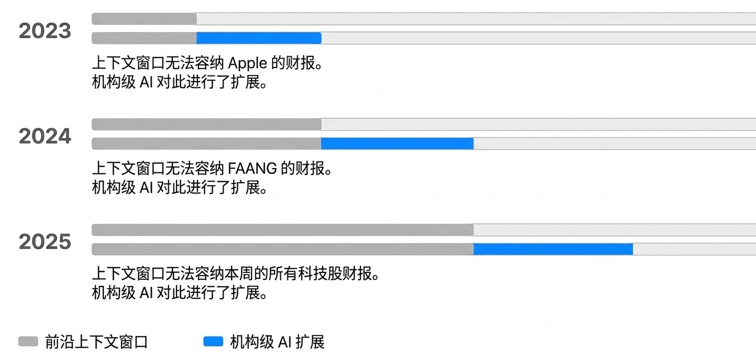 图 7:对于任何饱和具体的任务,其竞争上风(Edge)取决于你在前沿技能(Frontier technology)之上构建的机构化科罚决策。 咱们的用户经久在冲破前沿技能的极限。在短短四年内,大言语模子(LLM)的坎坷文窗口已从 4K 增长到了 100 万 token。现时,咱们已有一些用户在单次任务中处理高达 300 亿 token 的数据。本年,咱们展望将看到 1000 亿 token 级别的任务。每当基础模子的智力有所升迁时,咱们时时早已更进一步。